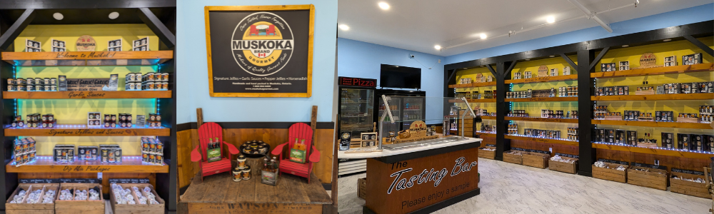 Located in beautiful Huntsville Ontario our retail store offers a whole new way to shop and enjoy our products! Our tasting bar is open daily so you can try out a new flavor and stock up on your favorites! Sneak a peak through the viewing window and watch the Muskoka Brand Family creating and packaging our products in our in house kitchen.